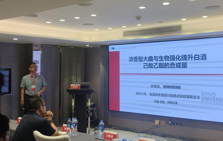 我校食品与生物工程学院院长唐洁教授、袁永俊教授、关统伟教授、刘青茹博士及2名硕士研究生参加了本次论坛。其中关统伟教授不仅主持了“国际蒸馏酒产业高质量发展论坛分会场”,并且在分会场中作了题为“浓香型大曲与生物强化提升白酒己酸乙酯的合成量”的报告,探讨了季节、贮藏时间及制曲工艺对浓香型大曲理化性质、风味物质及微生物群落结构的影响,分享了对浓香型大曲中蕴含特色功能性微生物资源的挖掘、生理代谢与功能机制解析、微生物安全性评价及应用等研究成果,发现了3株具有高己酸乙酯合成能力的微生物,开发了一款浓香型生物强化大曲,有效提升了浓香型白酒中己酸乙酯含量,解决了部分老窖池或新窖池己酸乙酯偏低的行业问题,也为生物强化改善白酒的风味与品质提供了新的解决方案。