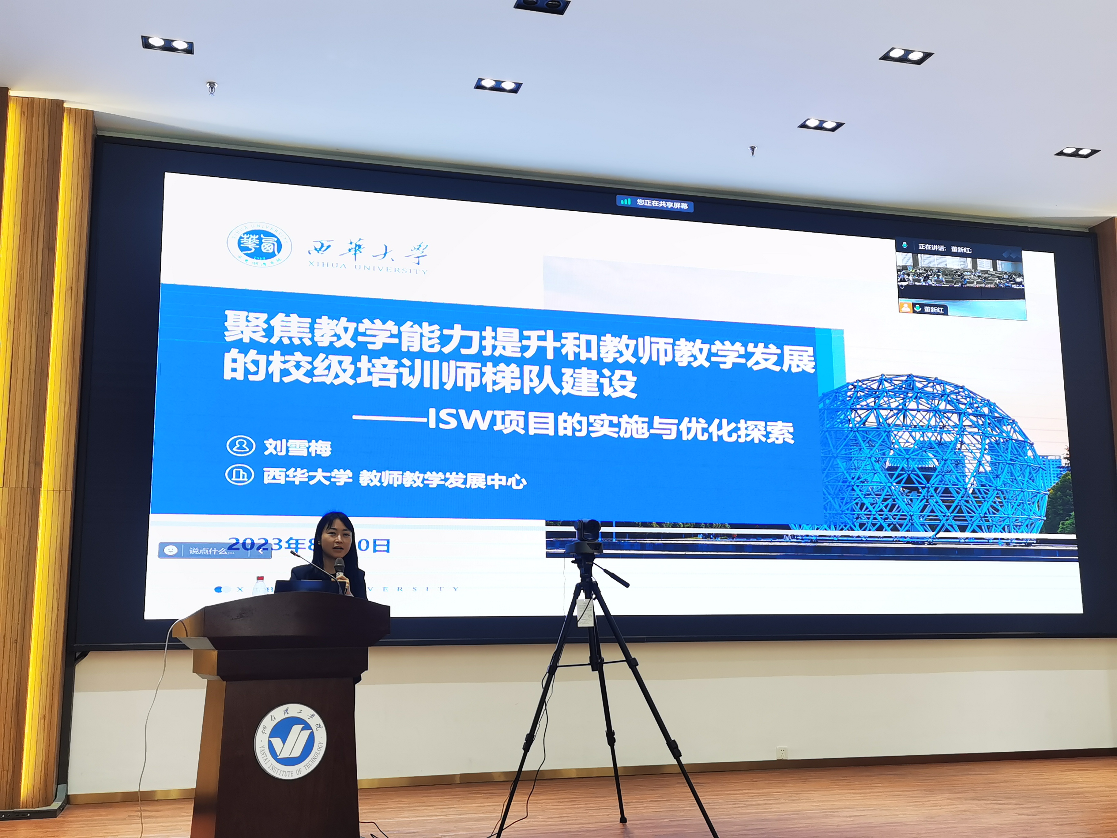 刘雪梅以“聚焦教师教学能力提升和教师教学发展的校级培训师梯队建设——ISW项目的实施与优化探索”为题作了大会主题报告。报告中,刘雪梅以学校教师教学发展中心服务教师教学能力提升、促进教师教学创新和教学质量保障,为教师提供学术性、支持性服务的机构定位手,从教师和课程两个维度探讨了在学校层面为何开展ISW,以及基于循证支持的ISW项目的探索、ISW项目促进教师发展的探索、ISW项目促进教师教学质量提升和课程建设的探索。