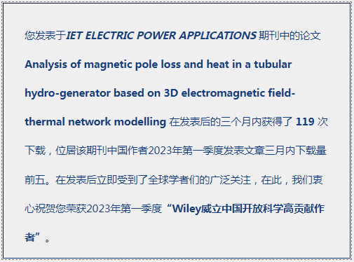 范镇南教授研究团队一项题为“Analysis of magnetic pole loss and heat in a tubular hydro-generator based on 3D electromagnetic field-thermal network modelling”的研究论文成果,于2023年初发表在电气设备本体分析研究领域的世界知名高水平期刊《IET ELECTRIC POWER APPLICATIONS》。