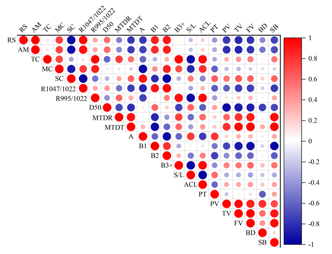 Fig. 5. Pearson correlation analysis of BTBNS, CBNS, BRS-AC and BRS-ACP starches. BTBNS, black Tartary buckwheat native starch; CBNS, common buckwheat native starch; BRS-AC, black Tartary buckwheat resistant starch subjected to autoclaving treatment; BRS-ACP, black Tartary buckwheat resistant starch subjected to autoclaving-pullulanase combined treatment. RS, resistant content; AM, Amylose content; TC, total crystallinity; MC, micro-crystalline; SC, sub-crystalline; R1047/ 1022, the ratios of absorbance of native and resistant starch at 1047 and 1022 cm-1 of ATR-FTIR; R995/1022, the ratios of absorbance of native and resistant starch at 995 and 1022 cm-1 of ATR-FTIR; D50, median particle size; MTDR, maximum thermal degradation rate; MTDT, maximum thermal degradation temperature; A, the rate of DP range from 6 to 12 in chain length distributions; B1, the rate of DP range from 13 to 24 in chain length distributions; B2, the rate of DP range from 25 to 36 in chain length distributions; B3+, rate of DP ≥ 37 in chain length distribution; S/L, short/long chain in branch chain-length distributions. BD, branching degree in chain length distribution; ACL, average Chain length; PT, peak time; PV, peak viscosity; TV, trough viscosity; FV, final viscosity; SB, setback.