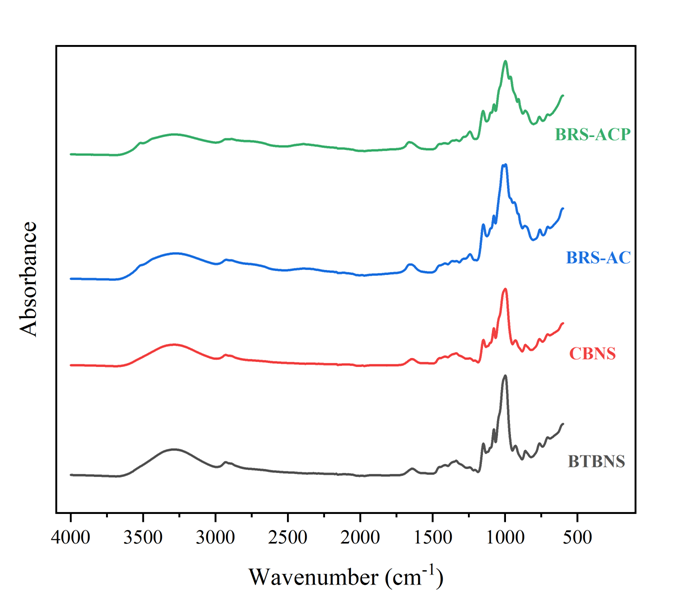 Fig. 4. Deconvoluted ATR-FTIR spectra of BTBNS, CBNS, BRS-AC and BRS-ACP starches.BTBNS, black Tartary buckwheat native starch; CBNS, common buckwheat native starch;BRS-AC, black Tartary buckwheat resistant starch subjected to autoclaving treatment; BRS-ACP, black Tartary buckwheat resistant starch subjected to autoclaving-pullulanase combined treatment.