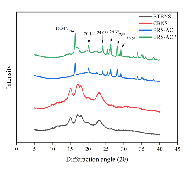 Fig. 3. XRD patterns of BTBNS, CBNS, BRS-AC and BRS-ACP starches. BTBNS, black Tartary buckwheat native starch; CBNS, common buckwheat native starch; BRS-AC, black Tartary buckwheat resistant starch subjected to autoclaving treatment; BRS-ACP, black Tartarybuckwheat resistant starch subjected to autoclaving-pullulanase combined treatment.
