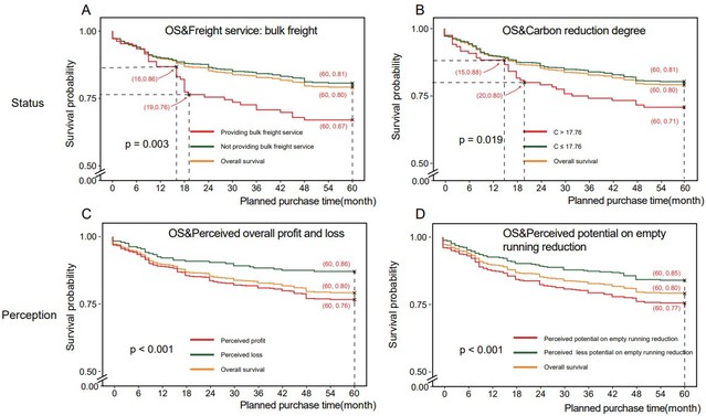 Figure 5. The survival probability of OS and related variables: (A) the OS and groups in the freight service (bulk freight); (B) the OS and groups in the carbon reduction degree; (C) the OS and groups in the perceived overall profit and loss, and (D) the OS and groups in the perceived potential on empty running reduction.