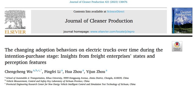 近日,汽车与交通学院的道路交通安全研究团队讲师巫诚诚在国际可持续发展领域顶刊Journal of Cleaner Production(一区,IF: 11.1)上发表题为“The changing adoption behaviors on electric trucks over time during the intention-purchase stage: Insights from freight enterprises’ states and perception features”的研究性学术论文。该研究工作得到了汽车测控与安全四川省重点实验室(QCCK2023-005)的资助。