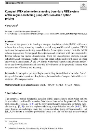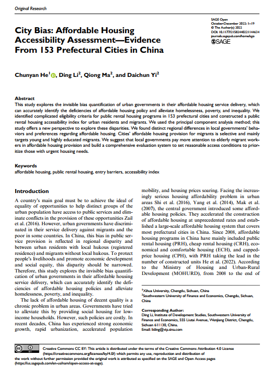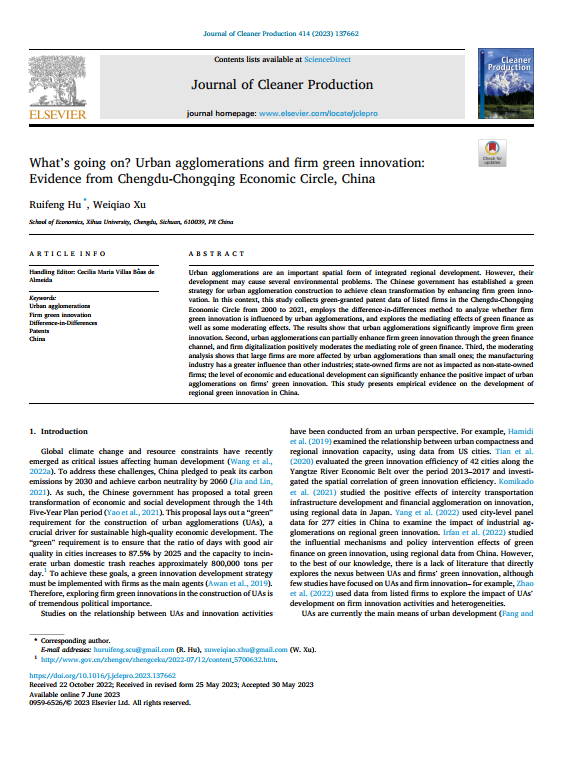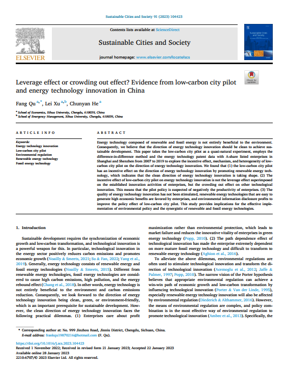近期,BMS科研团队在城市经济和绿色发展研究领域又取得新成果。屈放老师在SCI期刊《Sustainable Cities and Society》(中科院一区,第一作者)发表论文《Leverage effect or crowding out effect? Evidence from low-carbon city pilot and energy technology innovation in China》、胡锐锋老师在SCI期刊《Journal of Cleaner Production》(中科院一区)发表论文《What's going on? Urban agglomerations and firm green innovation: Evidence from Chengdu-Chongqing Economic Circle, China,第一作者》、陈勇老师在SCI期刊《Numerical Algorithms》(中科院三区,独立作者)发表论文《Compact IMEX scheme for a moving boundary PIDE system of the regime-switching jump-diffusion Asian option pricing》。论文运用量化研究方法,探究了能源技术创新、绿色创新对城市发展的影响作用。何春燕老师在SSCI期刊《Sage Open》(JCR二区,第一作者)发表论文《City Bias: Affordable Housing Accessibility Assessment-Evidence From 153 Prefectural Cities in China》,研究了城市住房保障发展水平及影响因子。