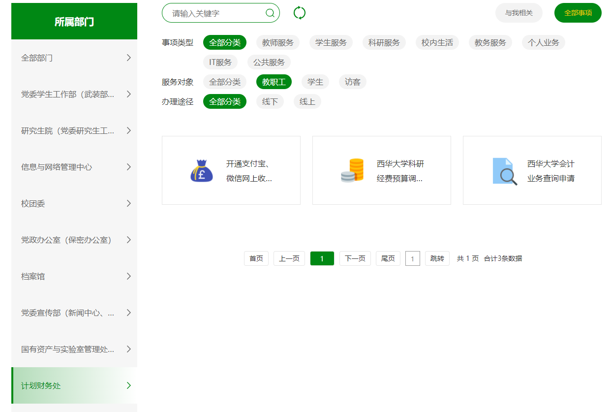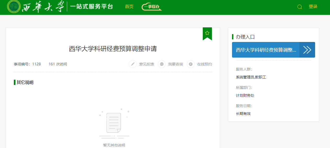 请各位老师通过学校一站式服务平台办理科研预算调整,不再提交纸质申请材料,具体操作如下: