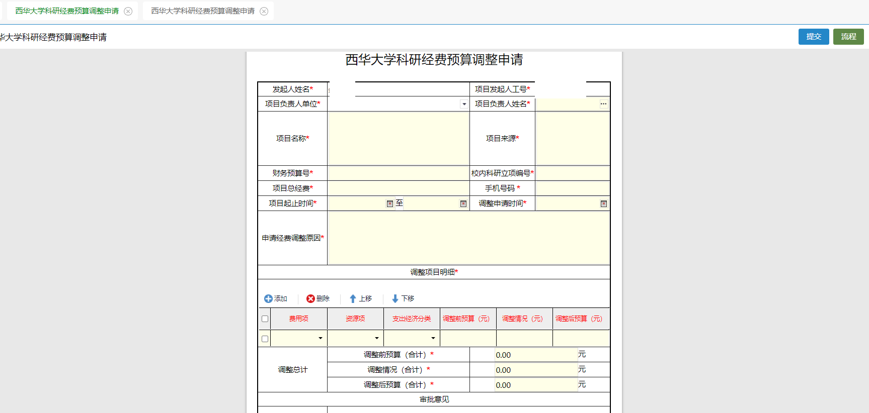 4、填写科研项目调整情况后,点击右上角【提交】,【流程】中可查询进度。