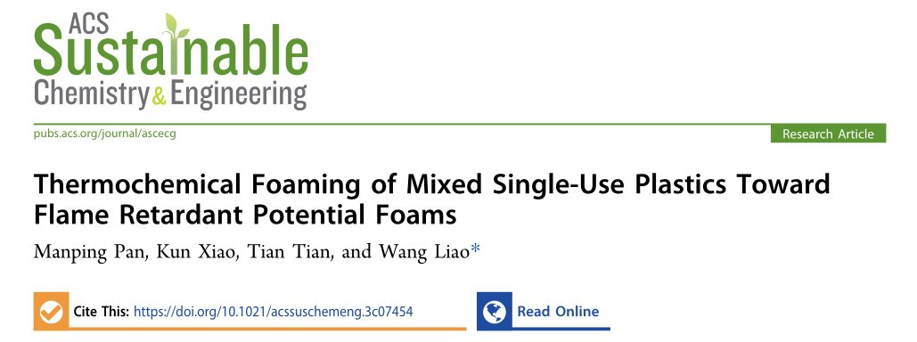 近期,理学院可持续发展和可循环利用多孔固体研究团队在化学综合性期刊ACS Sustainable Chemistry & Engineering (JCR 1区TOP,IF: 8.4)上发表题为“Thermochemical Foaming of Mixed Single-Use Plastics Toward Flame Retardant Potential Foams”的研究论文,论文的第一作者为理学院材料与化工专业硕士研究生潘曼坪,生物与医药专业研究生肖堃、田恬参与合作研究,通讯作者为英国上市公司365理学院廖望副教授。
