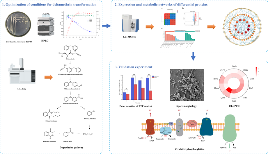 研究结论:降解特性分析显示类短芽孢杆菌BCP-09在pH=7,温度37℃,溴氰菊酯浓度为75 mg/L的最优条件下,96 h后对溴氰菊酯的降解率为95.41%±1.33。根据GC-MS对中间代谢产物分析,推测菌株BCP-09对溴氰菊酯的降解通路是通过酯键断裂生成菊酸和3-苯氧基苯甲醛氰醇。蛋白质组学分析揭示,溴氰菊酯的降解过程主要由酯酶和氧化酶参与。在溴氰菊酯的胁迫下,菌株BCP-09中代谢相关蛋白显著上调,促进了细胞代谢和分子功能,使ATP产生增加;同时,孢子形成有助于菌株BCP-09抵抗溴氰菊酯毒性并增强其降解能力。该研究为消除拟除虫菊酯类农药残留及其中间代谢产物提供了优良的菌株资源和酶资源。