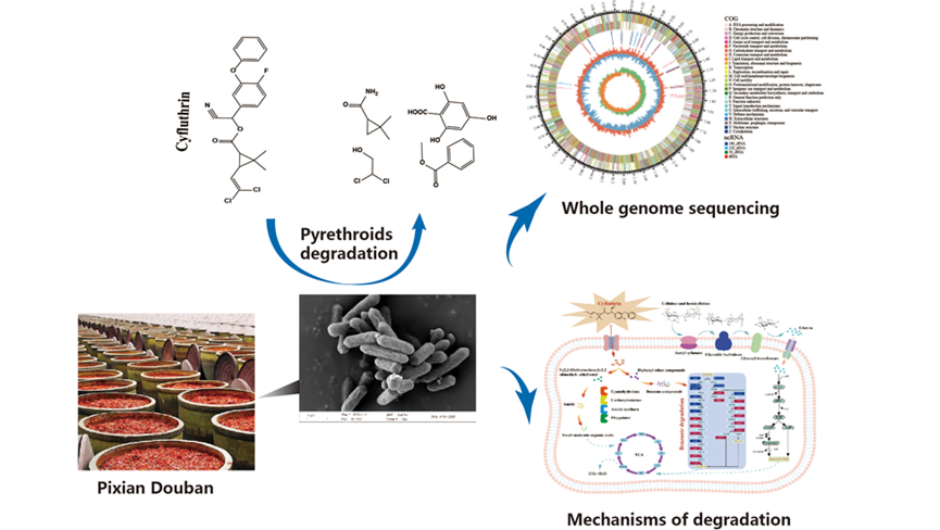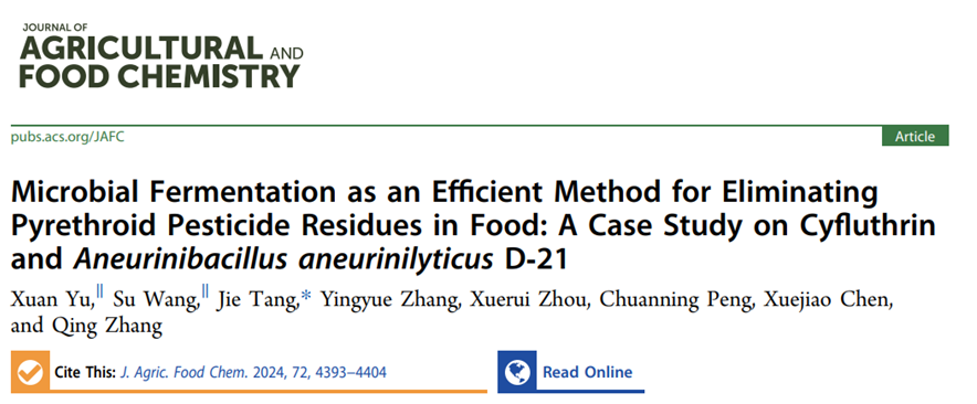 余萱,王素,唐洁(通讯作者)等在《Journal of Agricultural and Food Chemistry》期刊中发表的“Microbial Fermentation as an Efficient Method for Eliminating Pyrethroid Pesticide Residues in Food: A Case Study on Cyfluthrin and Aneurinibacillus aneurinilytcus D21”发现从传统发酵食品——郫县豆瓣中筛选得到的解硫胺素芽孢杆菌D-21可以有效降解氟氯氰菊酯,并将全基因组和代谢组数据结合分析,揭示了氟氯氰菊酯生物降解的新途径。