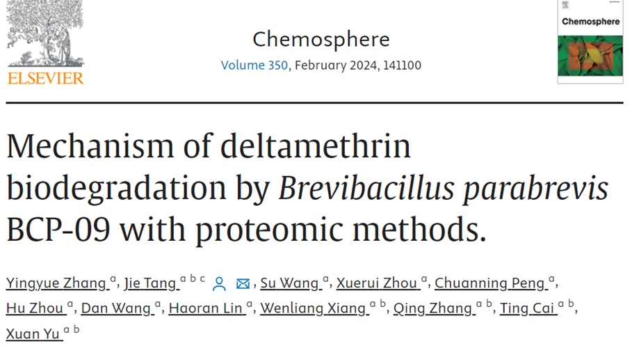 张潆月,唐洁(通讯作者)等在《Chemosphere》期刊中发表的“Mechanism of deltamethrin biodegradation by Brevibacillus parabrevis BCP-09 with proteomic methods”探讨了食品源微生物类短短芽孢杆菌BCP-09对溴氰菊酯的降解特性,并结合蛋白组分析技术从多个角度探讨了该菌对溴氰菊酯的降解机制。