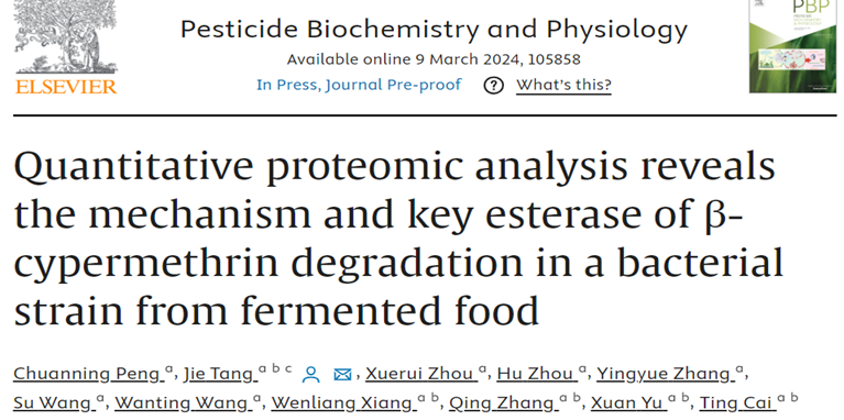 彭川宁,唐洁(通讯作者),周雪瑞等在《Pesticide Biochemistry and Physiology》期刊中发表“Quantitative proteomic analysis reveals the mechanism and key esterase of β-cypermethrin degradation in a bacterial strain from fermented food” 探讨了源于传统酿造郫县豆瓣中分离得到的食碱戈登氏菌GH-1对高效氯氰菊酯的降解机制,利用定量蛋白组分析揭示了氯氰菊酯的降解酶系,并通过异源表达技术,验证了参与降解的关键酯酶。