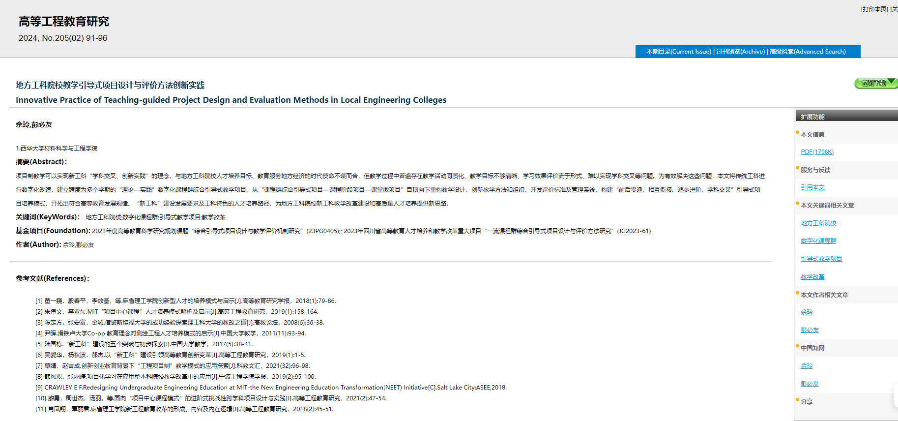 近日,材料科学与工程学院彭必友教学科研团队在CSSCI来源期刊《高等工程教育研究》发表名为“地方工科院校教学引导式项目设计与评价方法创新实践”的教研论文,论文第一作者为材料学院余玲高级实验师。该项研究工作得到2023年度高等教育科学研究规划课题“综合引导式项目设计与教学评价机制研究”(23PG0405)、2023年四川省高等教育人才培养和教学改革重大项目“一流课程群综合引导式项目设计与评价方法研究”、2023年英国上市公司365教育教学改革重点项目“综合引导式项目教学培养创新型人才的研究与实践”(xjjg2023003)的支持。