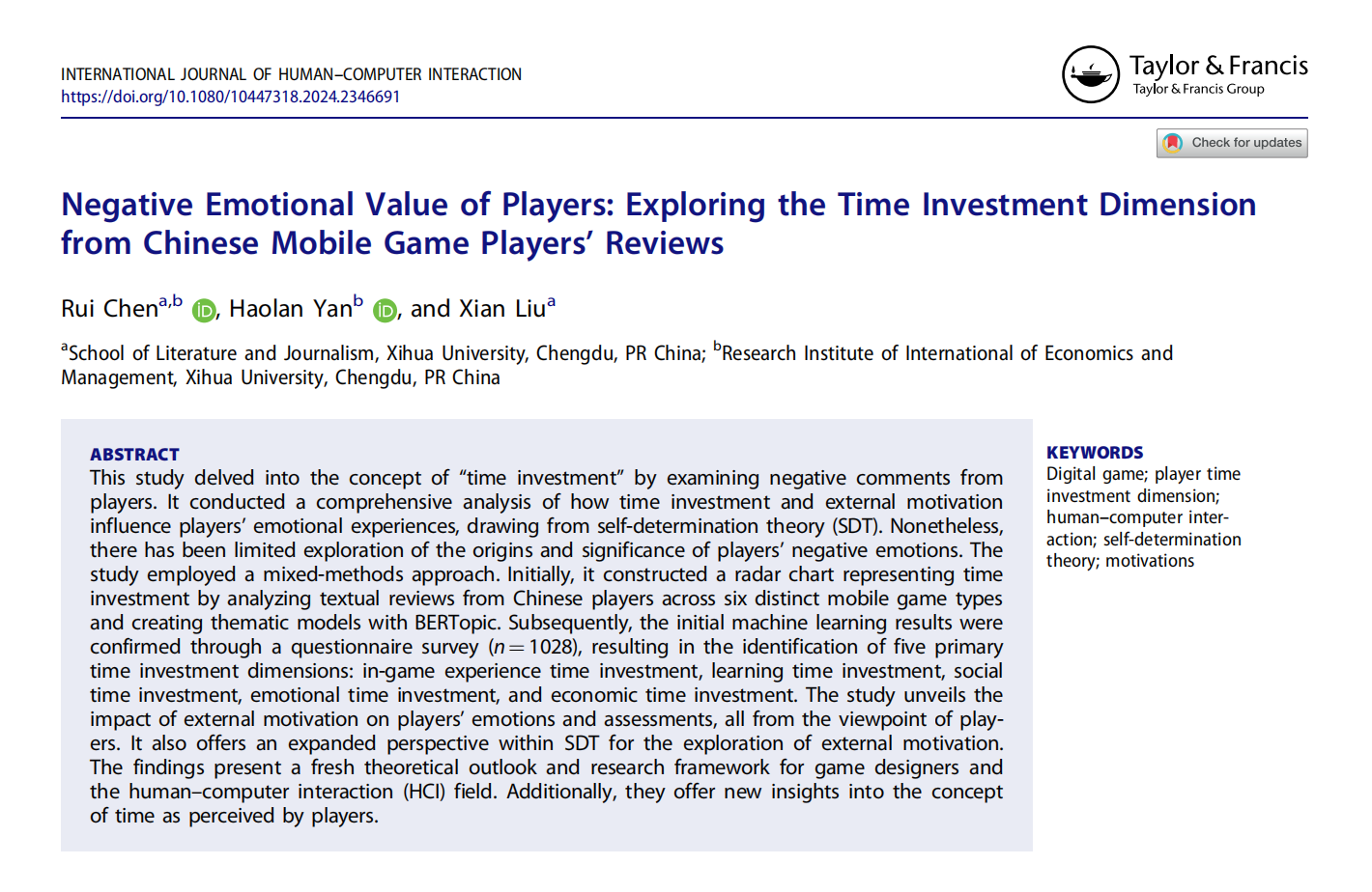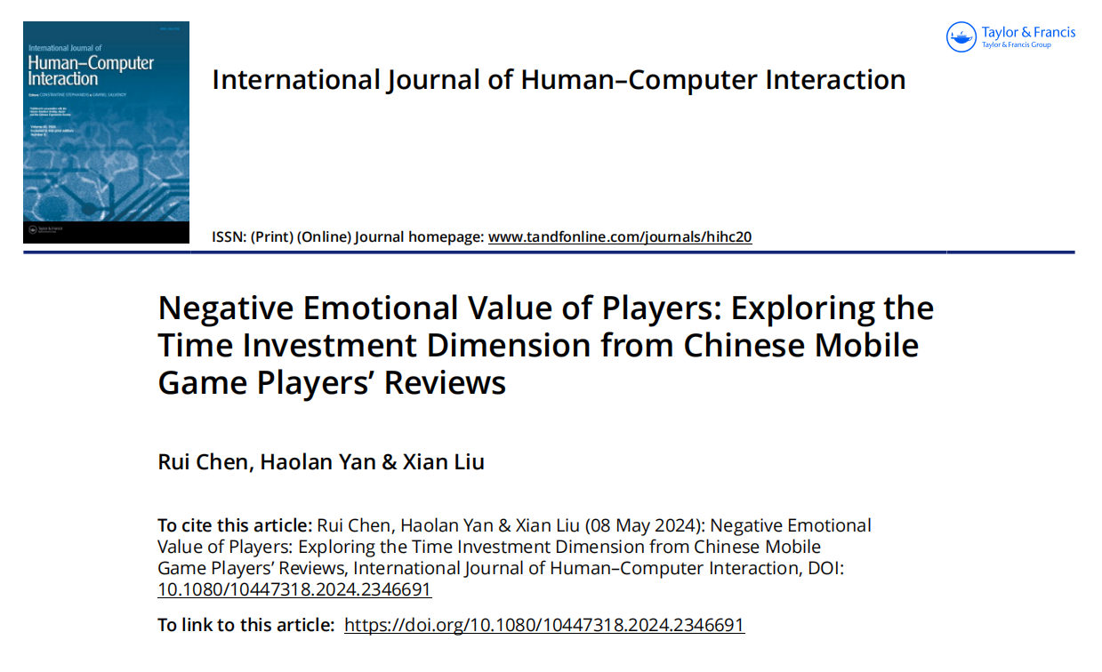 近日,文学与新闻传播学院、国际经济与管理研究院陈睿副教授研究团队,在计算机科学与人机交互领域国际期刊《International Journal of Human–Computer Interaction》(SSCI JCR 1区)发表题为“Negative Emotional Value of Players: Exploring the Time Investment Dimension from Chinese Mobile Game Players’Reviews”的文化研究论文;陈睿副教授为论文的第一作者,国际经济与管理研究院2022级工商管理专业硕士研究生严浩澜、文学与新闻传播学院2021级文艺学专业硕士研究生刘显为论文共同作者。英国上市公司365为论文的第一完成单位和通讯单位。该研究工作为国家自然科学基金面上项目(72374171)的阶段性成果之一。