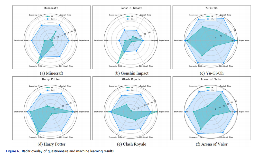 进一步地,通过问卷调查(n=1028)验证了机器学习的初步结果,并最终确定了玩家的五个主要时间投入维度:游戏内体验时间、学习投入时间、社交投入时间、情绪投入时间以及经济投入时间。