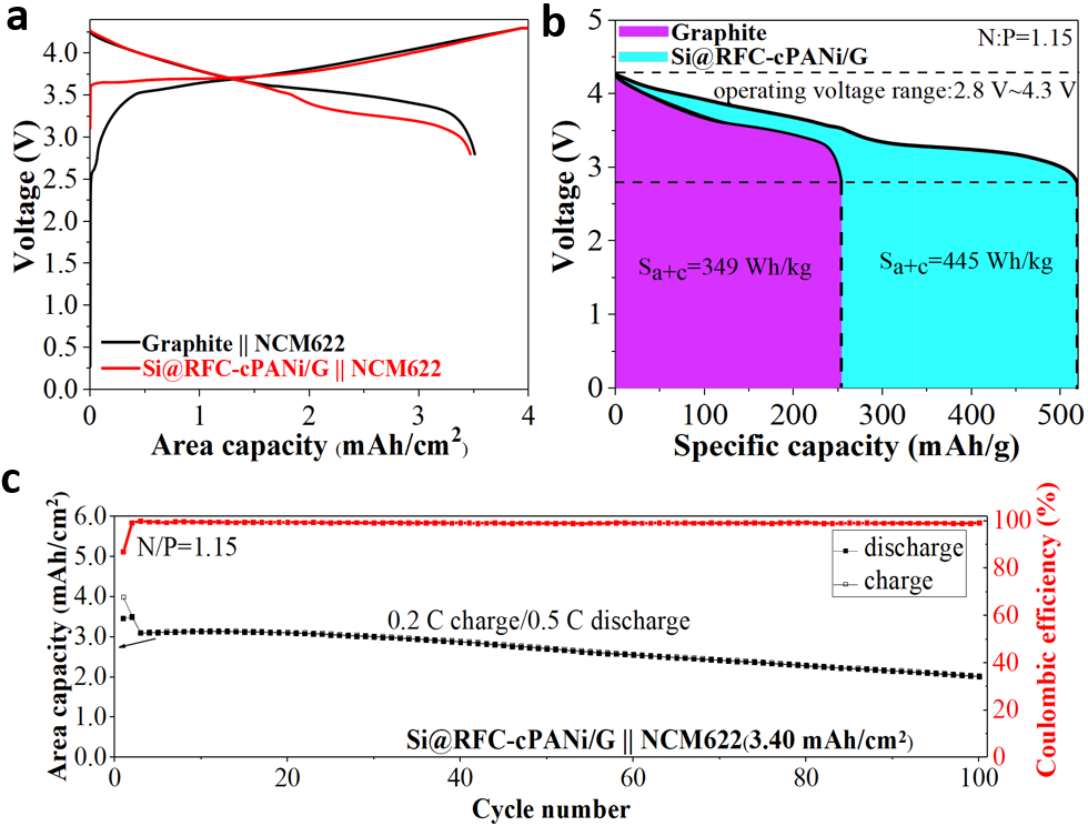 进一步考察Si@RFC-cPANi负极材料的实际效果。结果表明,基于正负极活性物质计算Si@RFC-cPANi/G || NCM622全电池的能量密度为445 Wh/Kg,相较于石墨 || NCM622全电池提高了~27%(图3)。