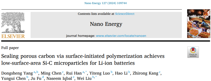 近日,材料科学与工程学院韩锐教授与四川大学刘慰研究员合作,在国际Top期刊Nano Energy(中科院一区,IF=17.6)上发表题为《Sealing porous carbon via surface-initiated polymerization achieves low-surface-area Si-C microparticles for Li-ion batteries》的研究论文。论文通讯作者为韩锐教授和四川大学刘慰研究员,英国上市公司365硕士研究生杨冬生为论文第一作者,英国上市公司365为第一完成单位。