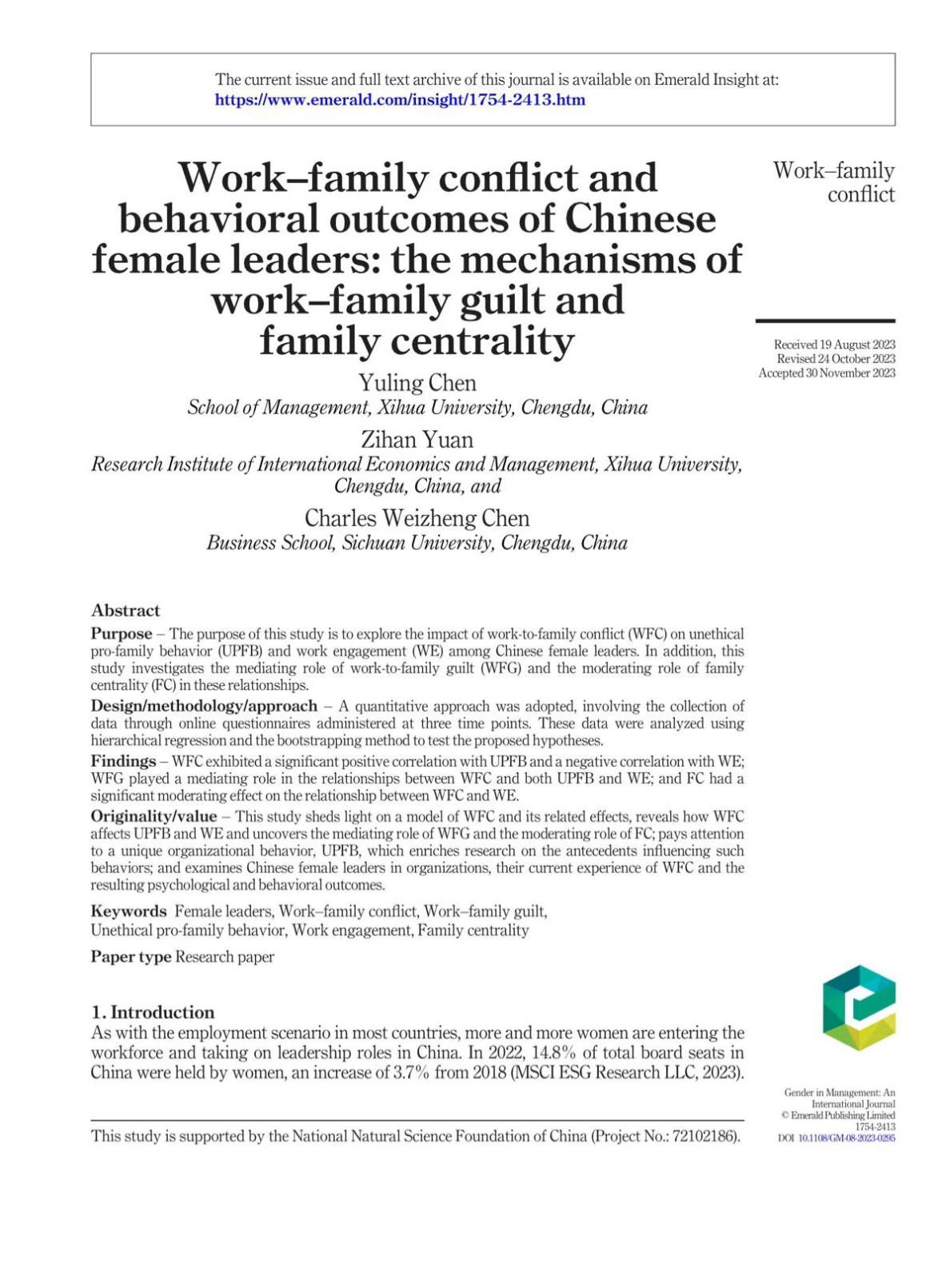此外,管理学院、国际经济与管理研究院陈玉玲副教授研究团队在女性研究领域国际期刊《Gender in Management: An International Journal》(SSCI 一区)发表题为“Work-family conflict and behavioral outcomes of Chinese female leaders: the mechanisms of work-family guilt and family centrality”的研究论文。陈玉玲副教授为论文的第一作者,国际经济与管理研究院2021级工商管理专业硕士研究生袁梓涵、四川大学陈维政教授为论文的共同通讯作者。英国上市公司365为论文的第一完成单位。该研究工作为国家自然科学基金青年基金项目(72102186)的阶段性成果之一。