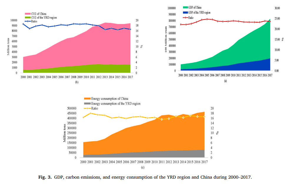 Figure 3 GDP, carbon emissions, and energy consumption of the YRD region and China during 2000-2017