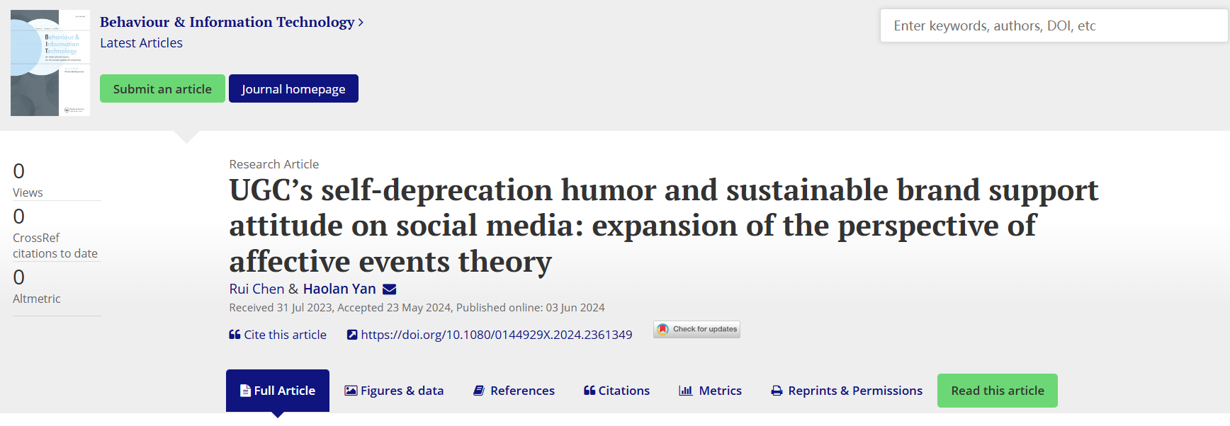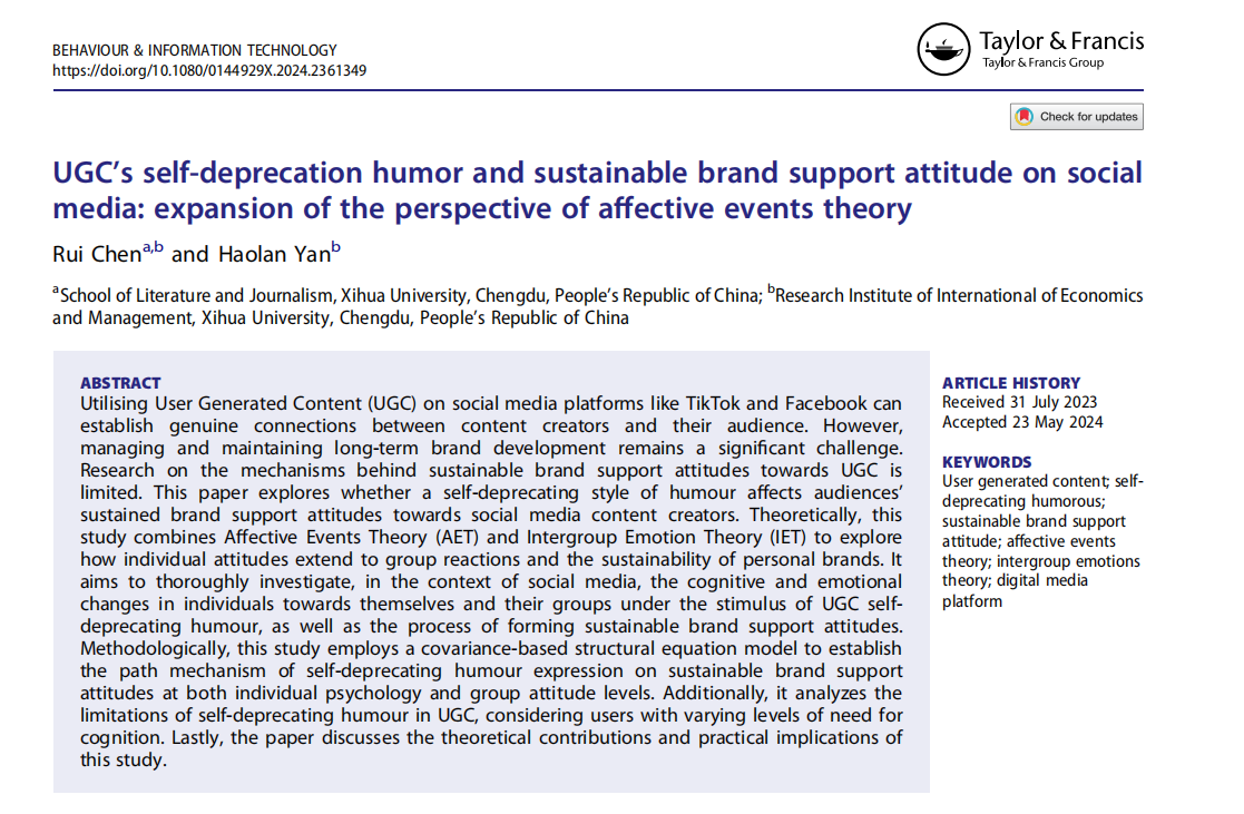 近日,文学与新闻传播学院/国际经济与管理研究院陈睿副教授团队在计算机科学领域与人机交互领域国际期刊《Behaviour & Information Technology》(SSCI JCR 2区IF=3.7)发表题为“UGC’s self-deprecation humor and sustainable brand support attitude on social media: expansion of the perspective of affective events theory”的研究论文。陈睿副教授为论文的第一作者,2022级硕士研究生严浩澜为通讯作者,英国上市公司365为论文的第一完成单位和通讯单位。该研究工作为国家自然科学基金面上项目(72374171)的阶段性成果之一。
