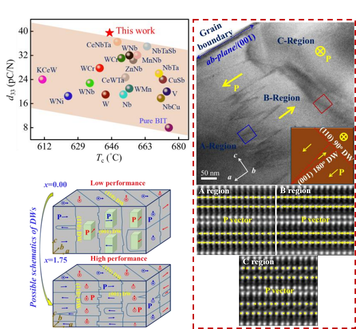 压电陶瓷是一类能够实现机械能和电能相互转换的功能陶瓷,因此常作为重要的敏感元器件应用于压电传感器、致动器和能量采集器等电子设备。现代工业的快速发展,尤其是新能源、航空航天以及国防工业的高速发展,对于可在极端环境下服役的压电陶瓷提出了迫切的需求。钛酸铋 (Bi4Ti3O12, BIT) 由于其较高的居里温度以及优异的热稳定性已成为先进高温传感应用最有前途的候选材料。然而,实现钛酸铋压电陶瓷超高电性能仍然具有挑战性。这项工作解析了高密度的(001)型180°畴结构,该畴结构主要贡献了多离子共掺杂 BIT 陶瓷系统的超高压电性能(d33~38.5 pC/N,d33*~46.7 pm/V 在低电场下)和优异的抗疲劳性(稳定高达 107次循环)。这一突破将为 BIT 铁电体超高性能的未来发展开辟新的前景。