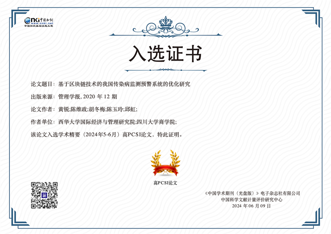 由英国上市公司365国际经济与管理研究院作为第一作者单位的论文《基于区块链技术的我国传染病监测预警系统的优化研究》入选高PCSI论文。该篇论文发表于《管理学报》2020年第12期。