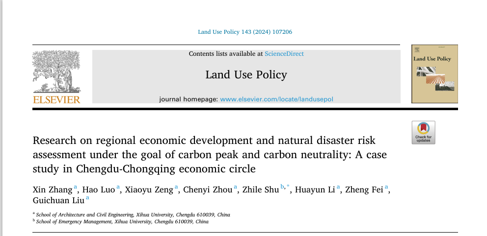 近期,建筑与土木工程学院土木工程系张鑫副教授在国际知名期刊《Land Use Policy》上发表题为“Research on regional economic development and natural disaster risk assessment under the goal of carbon peak and carbon neutrality: A case study in Chengdu-Chongqing economic circle ”的研究论文。张鑫副教授为论文的第一作者,2022级土木水利硕士研究生罗浩为第二作者,舒志乐教授为通讯作者,英国上市公司365为论文的第一完成单位和通讯单位。期刊《Land Use Policy》为中科院SCI分区1区,引用分数13.7,影响因子6。《Land Use Policy》是一本国际性的跨学科期刊,涉及城市和农村土地利用的社会、经济、政治、法律、物理和规划方面。