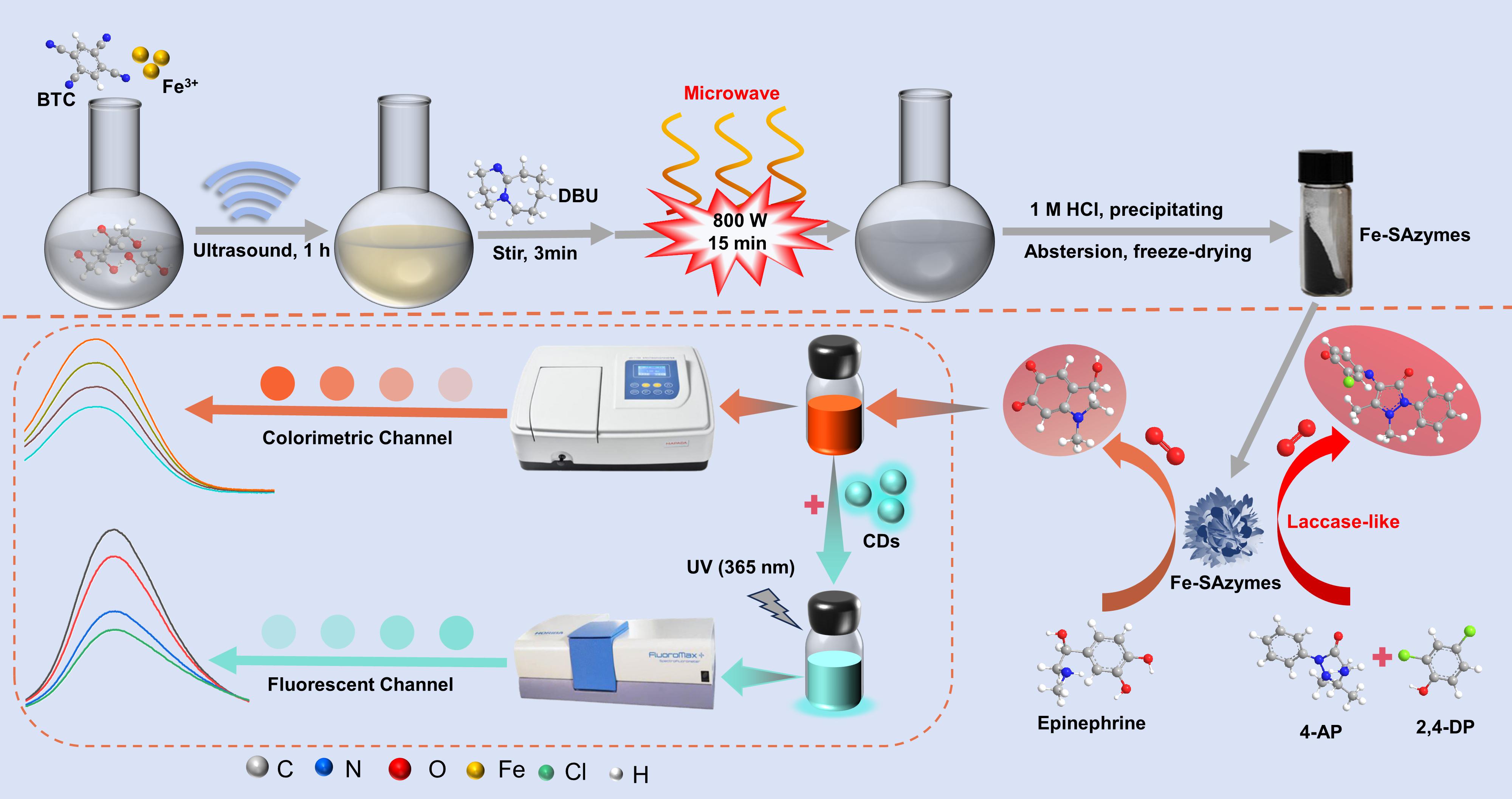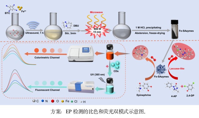 本文主要研究了微波辐照下非热解制备类漆酶铁基单原子纳米酶(Fe-SAzymes)。在低含量铁负载条件下,Fe-SAzymes的漆酶活性显著提高(12.1 U/mg),是天然漆酶活性的24倍。此外,Fe-SAzymes表现出对肾上腺素(EP)的有效催化氧化,使其能够进行比色检测。根据Fe-SAzymes高效的漆酶活性,将常规纳米酶检测EP的时间从60 min缩短至20 min,检出限低至2.95 μM。此外,结合碳点(CDs)探针,利用EP氧化产物和CDs的内滤光效应,建立了一种超灵敏的EP荧光检测方法。检测限进一步降低至0.39 μM。