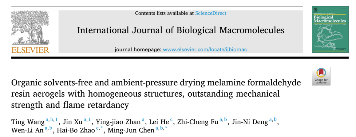 此外,创新地利用聚合物原位聚合三聚氰胺甲醛树脂的方法,成功实现兼具强度和韧性的三聚氰胺甲醛树脂的合成,实现无溶剂置换的常压干燥法制备高强度本征阻燃的三聚氰胺甲醛树脂气凝胶材料。其成果发表在材料科学领域主流刊物International Journal of Biological Macromolecules (中科院1区TOP,IF: 7.7),第一作者为理学院汪婷副教授和理学院2024届化学与生物医药硕士徐津,通讯作者为四川大学赵海波教授和陈明军教授,英国上市公司365为第一单位 。