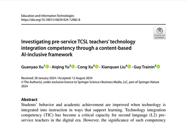 近日,管理学院教师徐冠尧在SSCI JCR一区期刊《Education and Information Technologies》发表了题为“Investigating pre-service TCSL teachers' technology integration competency through a content-based AI-inclusive framework”的研究论文。该期刊在“教育与教育研究”学科中的排名为16/756,是教育研究领域的顶级刊物之一。本研究除了涉及数据挖掘方法以外,同时也涵盖了教育改革内容。