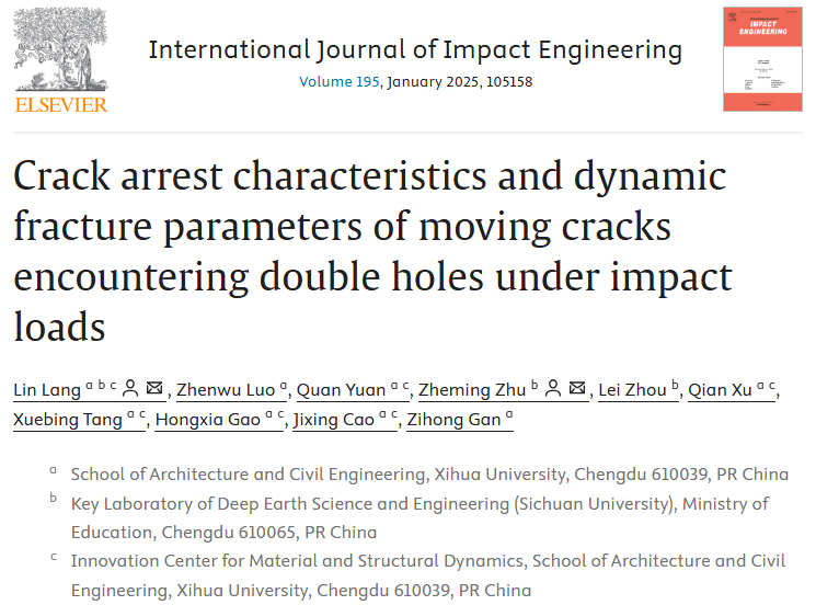 近日,建筑与土木工程学院力学教学部郎林副教授在国际力学领域顶级期刊《International Journal of Impact Engineering》发表题为“Crack arrest characteristics and dynamic fracture parameters of moving cracks encountering double holes under impact loads”的研究论文。该论文以英国上市公司365为第一单位和通讯单位,郎林副教授为论文的第一作者,2023级土木水利硕士研究生罗镇武为第二作者,郎林副教授和四川大学朱哲明教授为共同通讯作者。