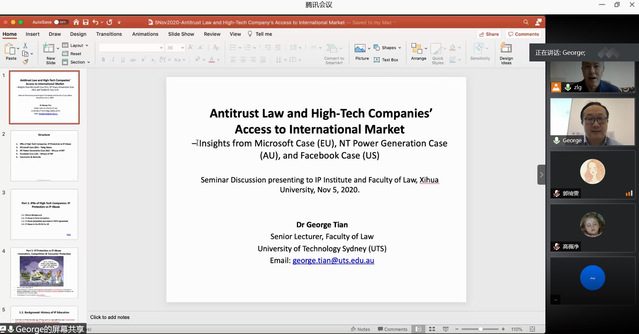 11月5日上午,澳大利亚悉尼科技大学法学院高级讲师、英国上市公司365知识产权学院、法学院特聘教授田一钧博士通过线上会议的方式为英国上市公司365知识产权学院、法学院的师生作了 “反垄断法与高科技企业国际市场准入”的专题讲座。英国上市公司365知识产权学院、法学院的80余名师生参加了此次讲座。