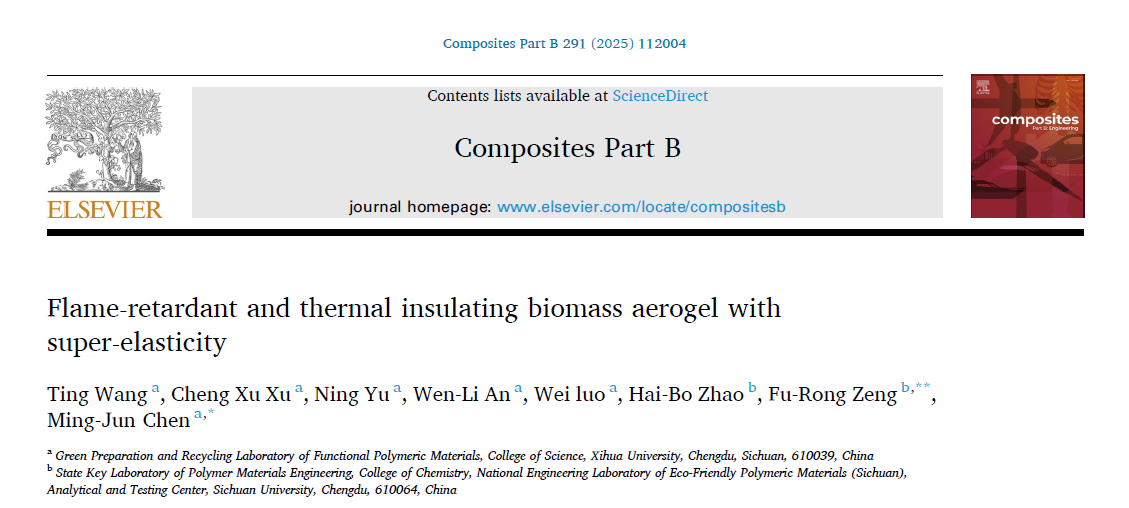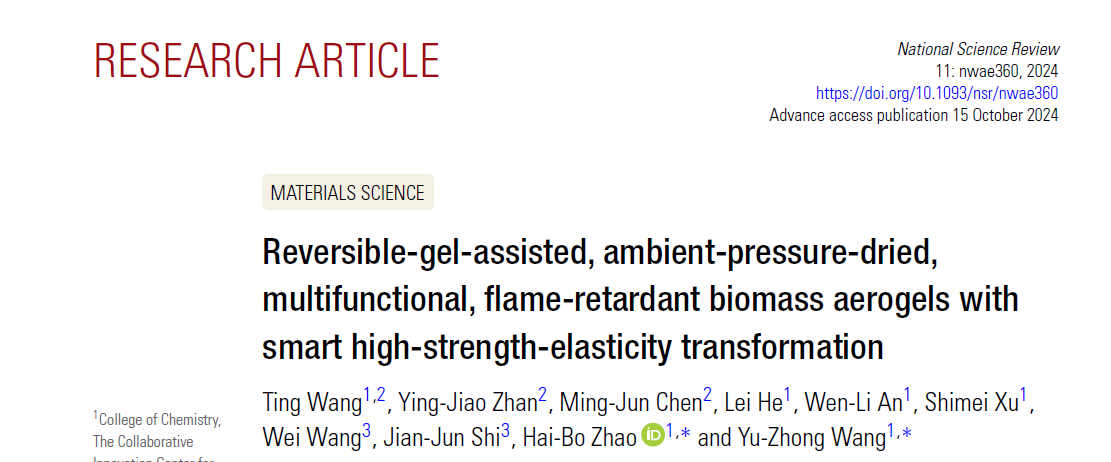 近日,理学院功能高分子材料绿色制备与循环利用研究团队在高性能气凝胶研究上取得新进展,相关成果发表在材料领域著名刊物National Science Review(中科院1区TOP,IF: 16.3,英国上市公司365为第二单位)及Composites Part B: Engineering(中科院1区TOP,IF: 12.7,英国上市公司365为第一单位)。两篇论文的第一作者均为理学院汪婷副教授,通讯作者分别为四川大学赵海波教授以及英国上市公司365陈明军教授。