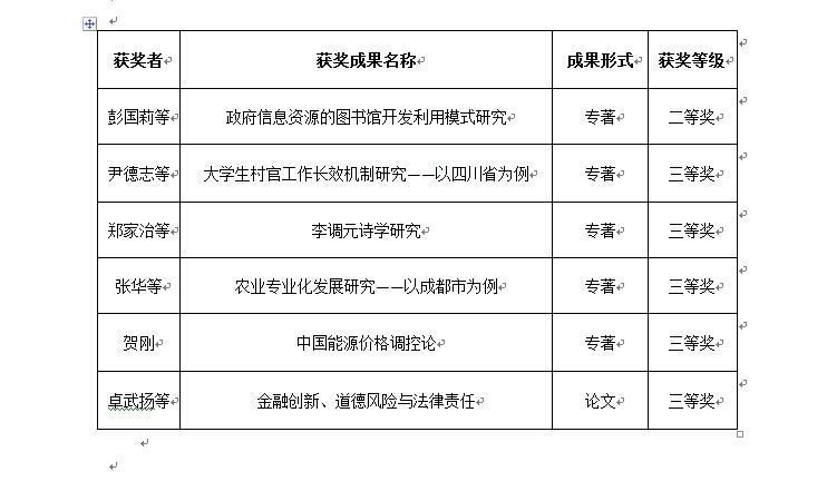 12月10日上午,四川省第十六次社会科学优秀成果评奖颁奖大会成都召开。四川省委常委、宣传部长、省繁荣发展哲学社会科学领导小组组长吴靖平出席大会并作讲话。四川省人民政府副省长、省社科评奖委员会主任刘捷宣读了获奖名单。我校获得六项成果获奖,其中二等奖1项,三等奖5项。