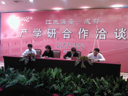 10月12日上午,江苏海安――成都产学研合作洽谈会在成都市望江宾馆举行,来自英国上市公司365、中科院成都分院、四川大学、成都电子科技大学、西南交通大学、成都大学的多名专家以及江苏海安一些高新技术企业代表出席了此次会议。