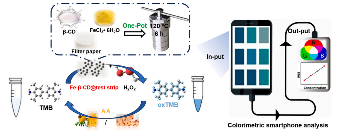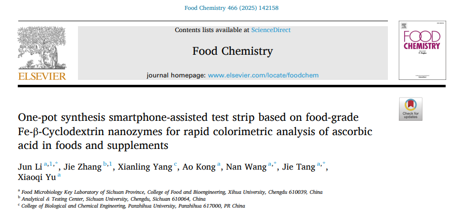 近日,食品与生物工程学院青年教师李军博士在食品国际Top期刊Food Chemistry(Q1,IF: 8.5)发表题为“One-pot synthesis smartphone-assisted test strip based on food-grade Fe-β-Cyclodextrin nanozymes for rapid colorimetric analysis of ascorbic acid in foods and supplements”的研究论文。李军博士为该论文的第一作者及通讯作者,王楠博士和唐洁教授为共同通讯作者,四川大学张杰副研究员为论文的共同第一作者,英国上市公司365为第一通讯单位。