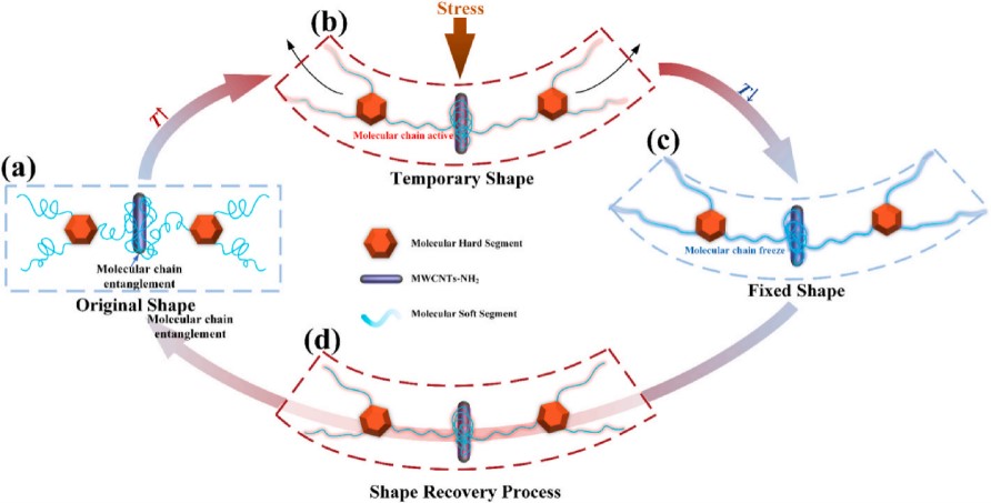 基于团队前期对PBZ及其纳米复合材料在结构材料方面的研究成果(Polym Compos. 2023;1-15. doi:10.1002/pc.27595; J. Appl. Polym. Sci. 2023, e53829; https://doi.org/10.1002/app.53829; Polym Compos. 2024;1-17. doi:10.1002/pc.28933),为了进一步探索PBZ纳米复合材料在功能及智能材料领域的应用,本研究首先通过分子设计并成功合成了新型的含柔性聚醚链段的苯并噁嗪预聚体,然后通过引入功能化多壁碳纳米管制备了PBZ形状记忆纳米复合材料。结果表明,多壁碳纳米管的表面基团与聚合物基体之间通过氢键和链段等超分子相互作用显著增强了PBZ的力学性能、耐热性能和形状记忆等性能,这为PBZ纳米复合材料在功能及智能材料领域的应用提供了有价值的借鉴。