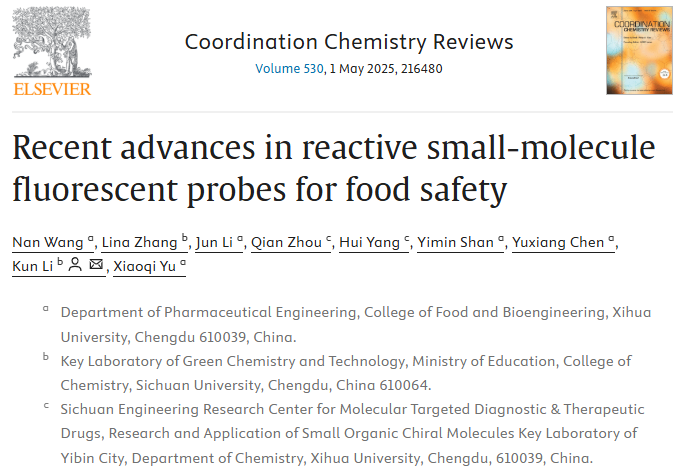 近日,食品与生物工程学院青年教师王楠博士在国际权威综述期刊 Coordination Chemistry Reviews(中科院一区,IF = 20.3)发表题为“Recent advances in reactive small-molecule fluorescent probes for food safety” 的综述论文。王楠博士为该论文的第一作者,英国上市公司365为第一通讯单位,四川大学李坤教授为该论文的通讯作者。