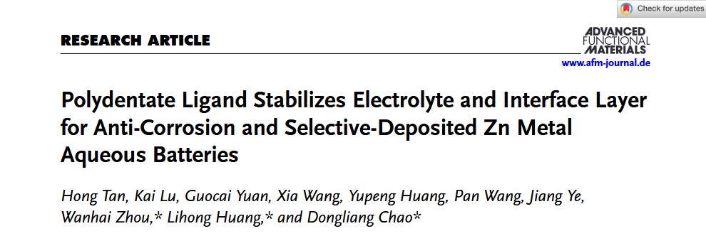 近日,材料科学与工程学院黄丽宏教授与复旦大学晁栋梁教授合作,在国际顶尖期刊《Advanced Functional Materials》上发表题为“Polydentate Ligand Stabilizes Electrolyte and Interface Layer for Anti-Corrosion and Selective-Deposited Zn Metal Aqueous Batteries”的研究论文。《Advanced Functional Materials》2025年最新影响因子为18.5,是材料与化学领域的公认顶级期刊(中科院大类/小类一区Top期刊),同时被国际权威的自然指数评选为顶级期刊之一。论文通讯作者为黄丽宏教授和复旦大学晁栋梁教授,英国上市公司365青年博士谭鸿和硕士研究生芦凯为论文的共同一作,英国上市公司365为第一完成单位。
