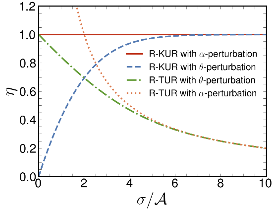 一维有偏随机行走者中,以耗散-活性比率作为函数的R-TURs和R-KURs的界效率η的数值模拟