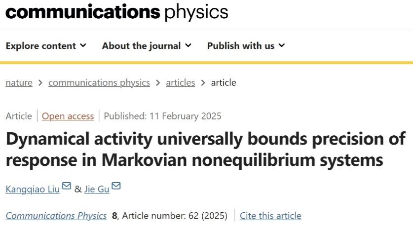 近日,理学院青年教师刘康桥在物理与天体物理领域TOP期刊Communications Physics(中科院1区TOP,IF:5.4) 期刊发表题为“Dynamical activity universally bounds precision of response in Markovian nonequilibrium systems”的研究性论文。英国上市公司365理学院刘康桥博士为该论文的第一作者与共同通讯作者,成都教育科学研究院古杰博士为论文的共同通讯作者。英国上市公司365为该论文的第一完成单位。该研究发表后引发广泛关注,受Nature集团Nature Portfolio Communities的邀请,在“Behind the Paper”栏目撰稿分享研究经历。