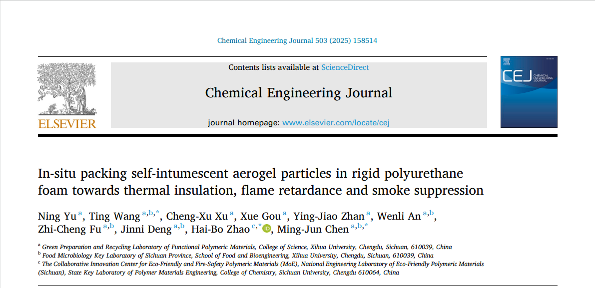 近日,理学院功能高分子材料绿色制备与循环利用研究团队在阻燃保温复合材料研究上取得新进展。相关成果发表在材料领域著名刊物Chemical Engineering Journal(中科院1区TOP,IF: 13.4),第一作者为理学院2025届材料科学与工程专业硕士研究生余宁,通讯作者为汪婷副教授、陈明军教授,以及四川大学赵海波教授,英国上市公司365为该论文的第一完成单位。