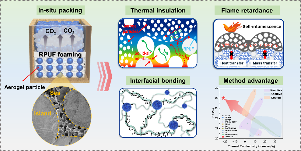 针对这一难题,本课题组提出了一种新颖、简单的界面键合和原位填充策略,将自膨胀的生物质气凝胶胶粒引入RPUF。构筑独特“海-岛”孔结构以创建复杂的导热路径和增强的界面热阻,成功解决了阻燃性能与保温性能的矛盾问题。向RPUF中引入气凝胶胶粒可以将导热系数从36.5 mW/m·K降低到28.6 mW/m·K,保温性能提升约21.6%。此外,气凝胶/RPUF复合材料表现出优异的阻燃性能,极限氧指数(LOI)显著提升至28%,峰值放热率(- 38.0%)和产烟率(- 54.0%)显著降低,表现出优异的火安全性。不仅如此,气凝胶/RPUF复合材料的抗压强度显著提高(+ 93.7%),与同领域工作相比,该工作的火安全性能和隔热保温性能等均具有突出优势。因此,该工作为制备具有高阻燃效率和优异保温性能的RPUF复合材料提供了新的思路。