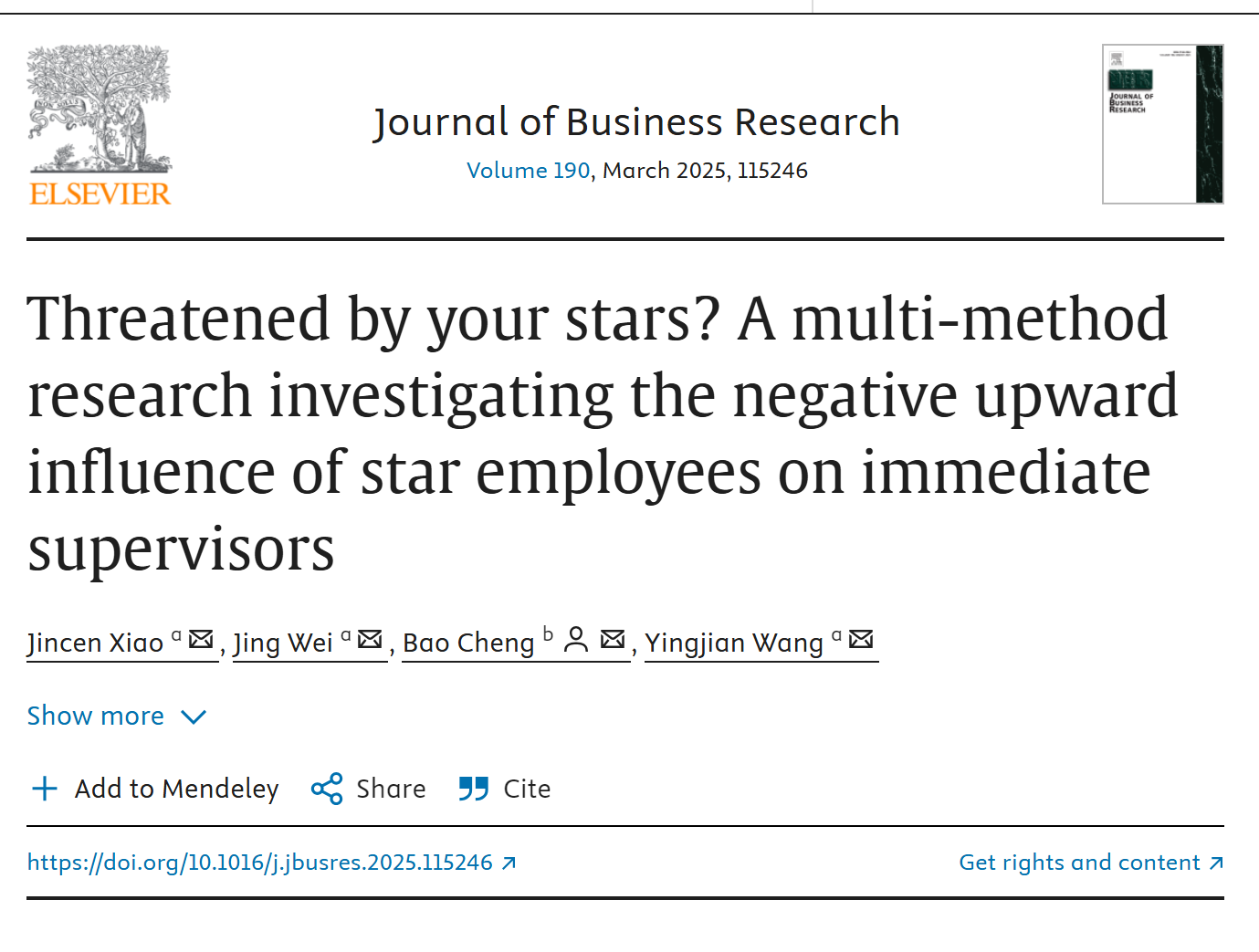 近日,英国上市公司365管理学院肖金岑副教授课题组在管理学领域国际一流期刊Journal of Business Research发表题为“Threatened by your stars? A multi-method research investigating the negative upward influence of star employees on immediate supervisors”的学术论文。肖金岑副教授是文章第一作者,管理学院研究生韦静、王英健分别为文章第二、第四作者。