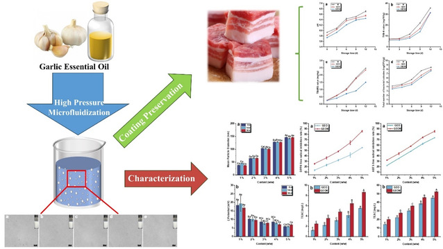 张兴中,王颖,王丹,唐洁,徐敏(通讯作者)等在《International Journal of Biological Macromolecules》期刊中发表的“Synergistic stabilization of garlic essential oil nanoemulsions by carboxymethyl chitosan/Tween 80 and application for coating preservation of chilled fresh pork”通过高压微射流化制备了由羧甲基壳聚糖(CCS)和Tween 80(TW 80)协同稳定的大蒜精油(GEO)纳米乳液,并应用于冷鲜猪肉的涂膜保鲜。