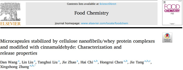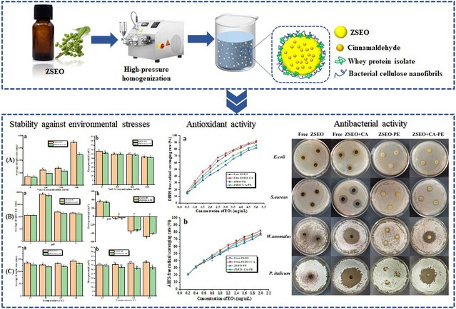 王丹,刘琳,唐洁(通讯作者),张兴中(通讯作者)等在《LWT-Food Science and Technology》期刊中发表的“Fabrication and characterization of Zanthoxylum schinifolium essential oil Pickering emulsion stabilized by bacterial cellulose nanofibrils/whey protein isolate complexes and fortified with cinnamaldehyde”构建了由细菌纤维素纳米纤维/乳清蛋白复合物稳定并用肉桂醛强化的青花椒精油Pickering乳液,并探究了肉桂醛的存在对乳液稳定性和抗抗环境胁迫稳定性的影响,以及精油包埋体系对精油抗氧化活性和抗菌性能的影响。