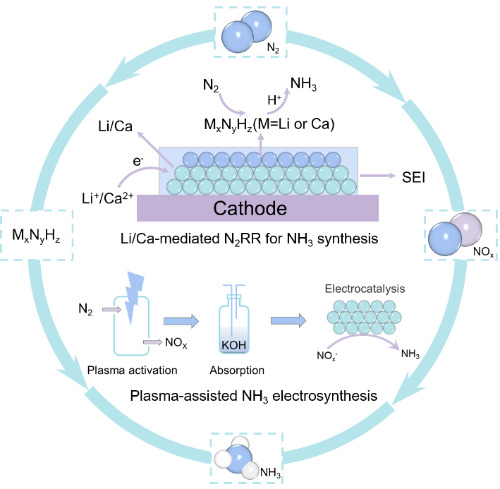 通过Li/Ca介导N2还原或Plasma辅助电化学合成氨反应原理示意图