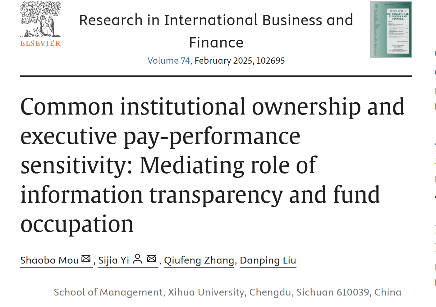 近日,管理学院牟绍波教授团队在国际学术期刊Research in International Business and Finance(SSCI一区期刊,影响因子:6.3)发表了题为“Common institutional ownership and executive pay-performance sensitivity: Mediating role of information transparency and fund occupation”的研究论文。牟绍波教授为第一作者,2022级硕士研究生易思佳为第二作者兼通讯作者,张秋凤博士和刘丹萍副教授分别为第三、第四作者。