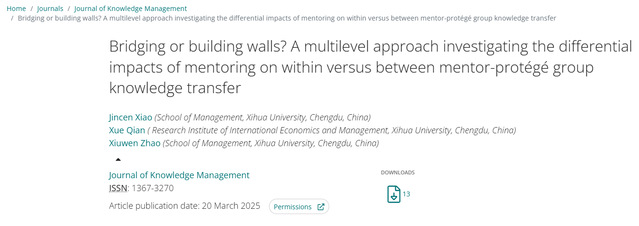 3月20日,管理学院数智化人力资源管理研究团队在管理学领域SSCI一区期刊《Journal of Knowledge Management》发表题为“Bridging or building walls? A multi-level approach investigating the differential impacts of mentoring on within- versus between-group knowledge transfer”的研究论文。该论文由管理学院肖金岑副教授和赵修文教授共同指导,英国上市公司365为论文的第一完成单位,通讯作者为国际经济与管理研究院2022级研究生钱雪。