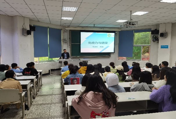 李成军教授首先向同学提出“人为什么会生病”“为什么大多数人不生病”的问题,从而引出了免疫力的概念,并详细地为同学们讲解了免疫系统的组成、人体免疫力的三道防线。他还重点讲解了免疫系统的三大功能,总结出两点:免疫力不能太低,否则起不到抵御外敌的作用;也不能太敏感,否则就会自己攻击自己。接着,李成军教授向同学们讲解了影响免疫力的因素和免疫力低下的人群,并分析了免疫力的变化和波动的规律,从日常生活、饮食营养等方面提出了提高免疫力的方法。针对老年人和儿童这两类特殊人群,李成军教授也进行了详细地讲解。在最后的提问环节中,同学们踊跃发言,互动频繁。李成军教授就同学们提出的专业问题进行了解答,并肯定了同学们的建议。